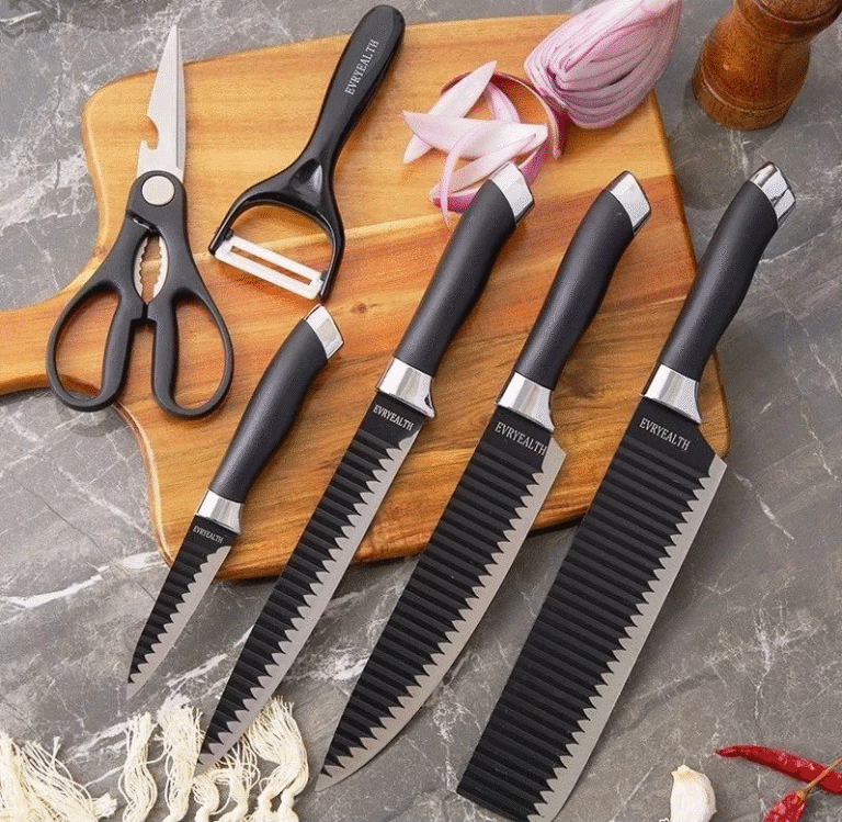 Jogo de facas com seis peças especializadas, com revestimento antiaderente, lâminas superafiadas, lindo design na cor preta.